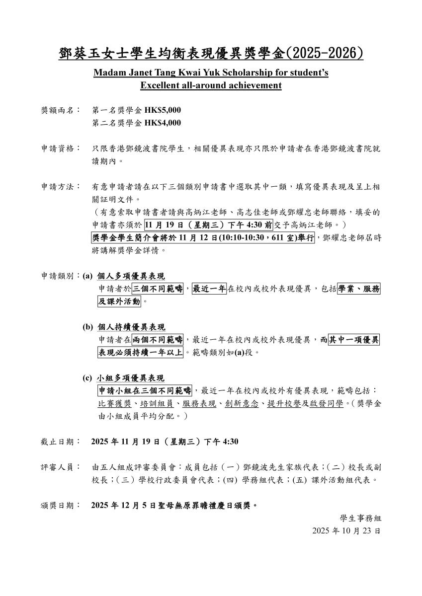 鄧葵玉女士學生均衡表現優異獎學金申請表