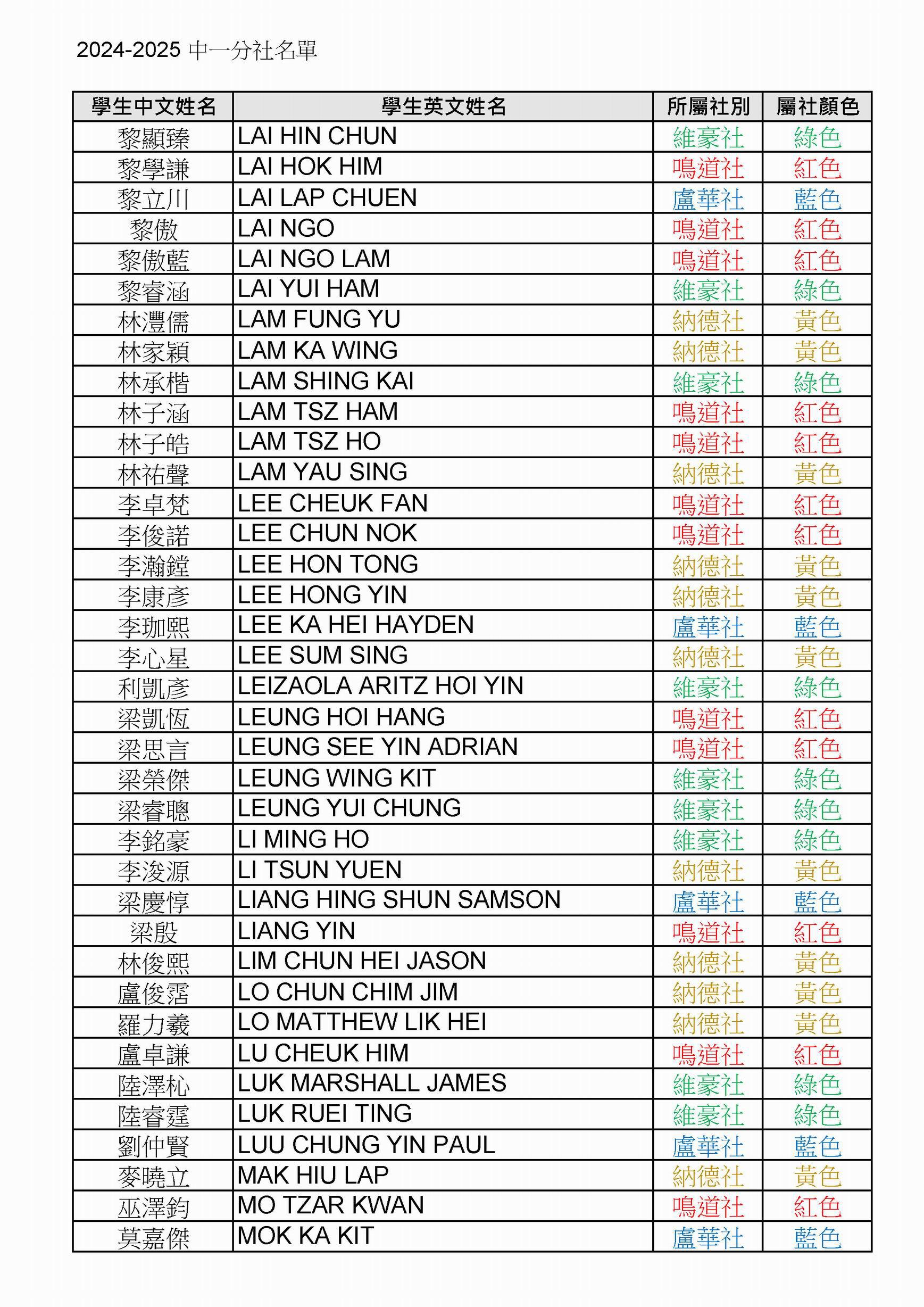 2024-2025 中一分社名單