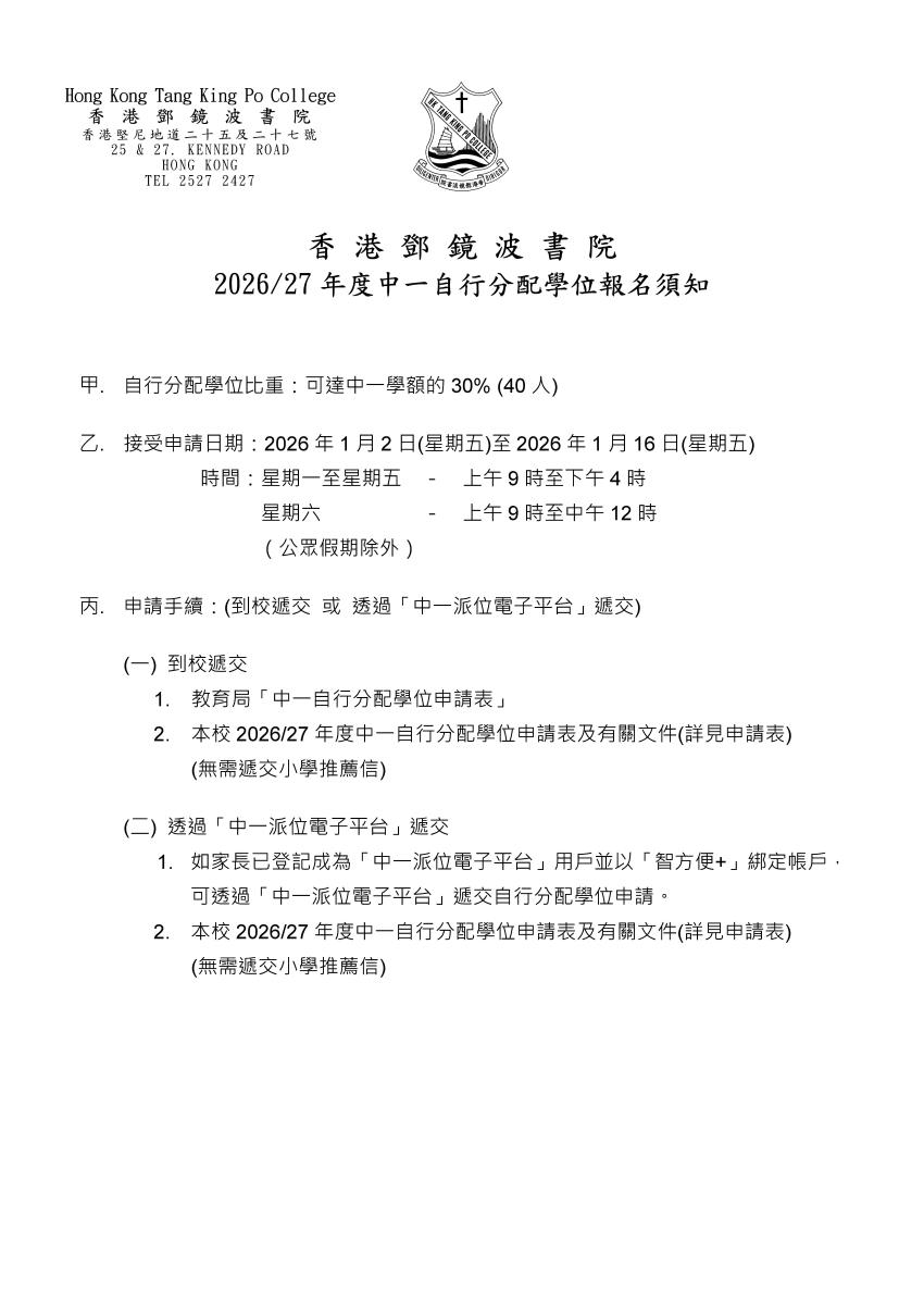 2026 -27 中一自行分配學位_申請表HKTKPC
