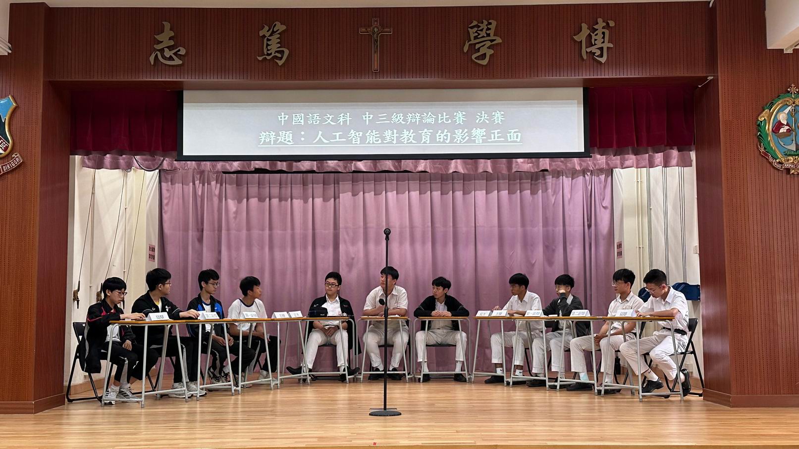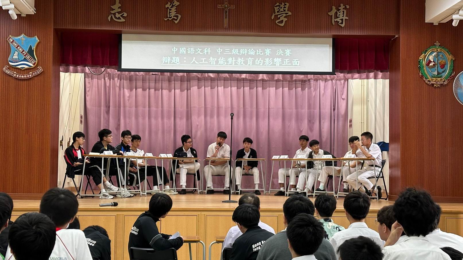 中三級班際辯論決賽於2024年5月7日第3節在禮堂舉行,辯題為「人工智能對教育的影響正面」,中辯校隊師兄們賽前協助指導,3A和3B班同學表現投入,經過一番激辯,3B班勝出獲冠軍,3A 班獲亞軍,3A 班李文標同學奪得「最佳辯論員」獎項,賽事圓滿結束。